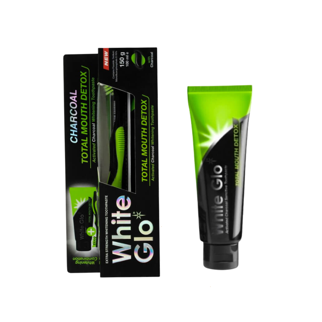 White Glo Total Mouth Detox on valgendav hambapasta aktiivsöe osakestega, mis muudavad hambad valgeks ning hingeõhu värskeks. Aktiivsöega Valgendava toimega Kaasas käsihambahari Sisaldab fluoriidi 1000 ppm F